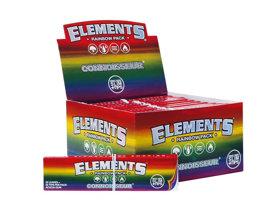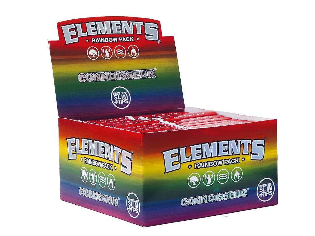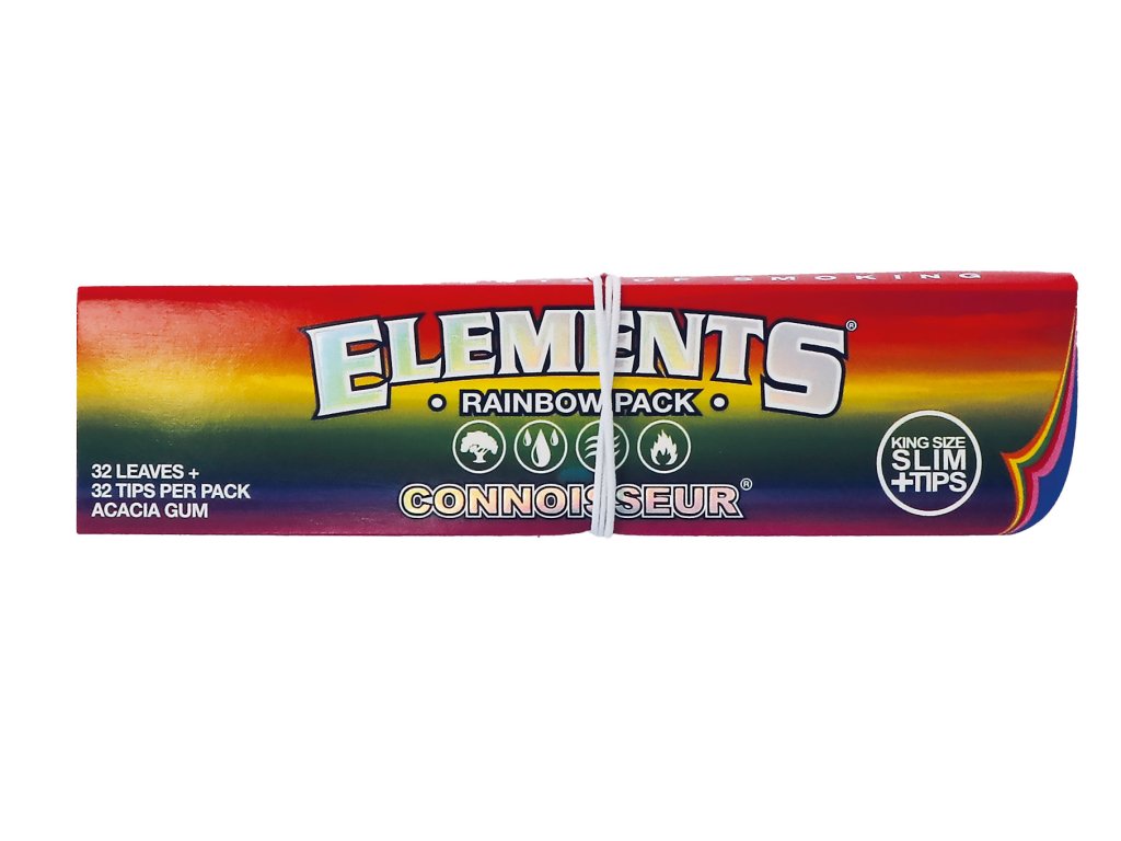 Elements® Rainbow Connoisseur King Size Slim jsou ideální volbou pro ty, kteří chtějí kompletní balicí řešení v jednom balení. Najdete zde ultra tenké rýžové papírky spolu s odpovídajícími filtry, takže máte vše potřebné vždy po ruce.