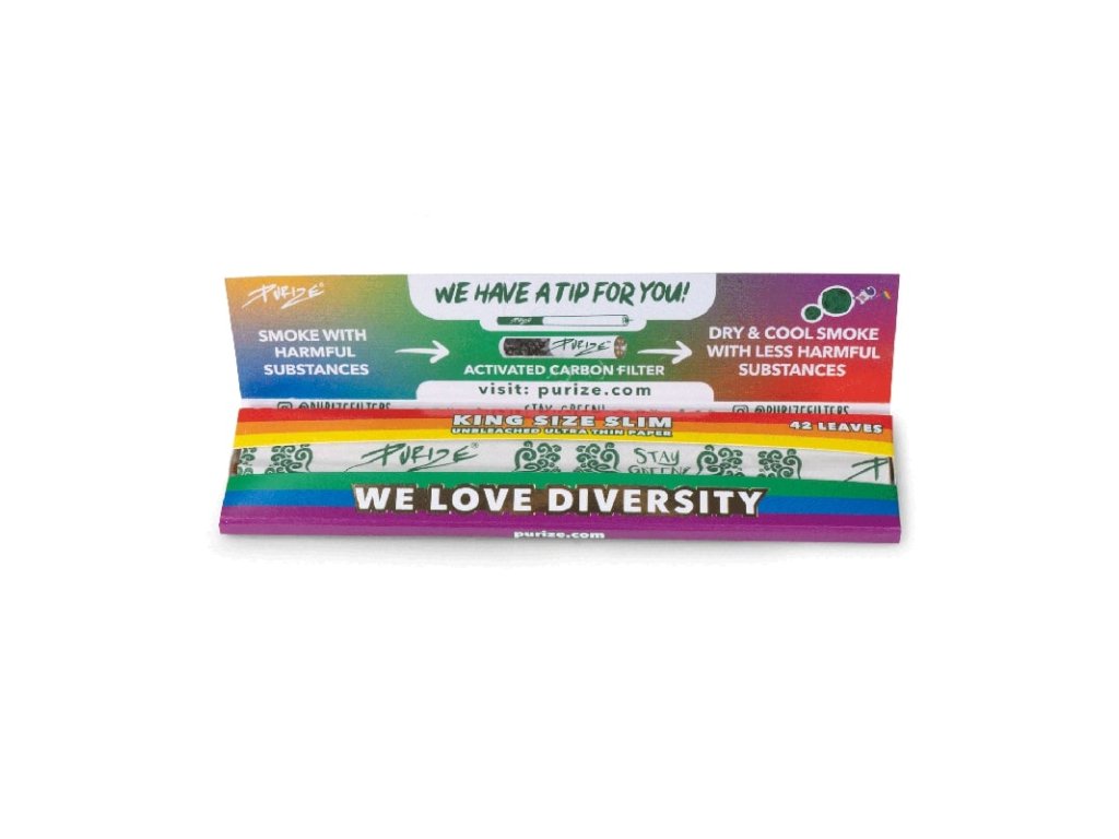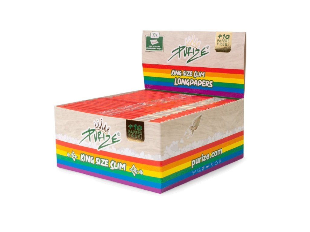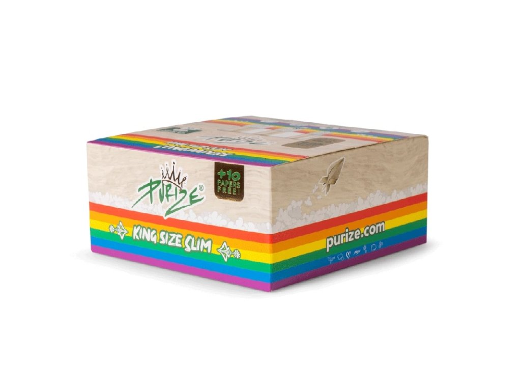 Purize® Brown King Size Slim DUHA spojují čistě přírodní materiál s výrazným duhovým vzhledem. Papírky jsou nebělené, vyrobené bez chemického bělení a zbytečných přísad, takže nechávají vyniknout přirozené aroma bylin bez rušivých tónů.