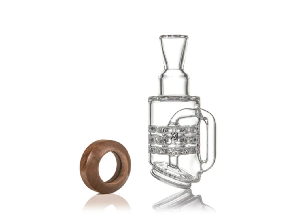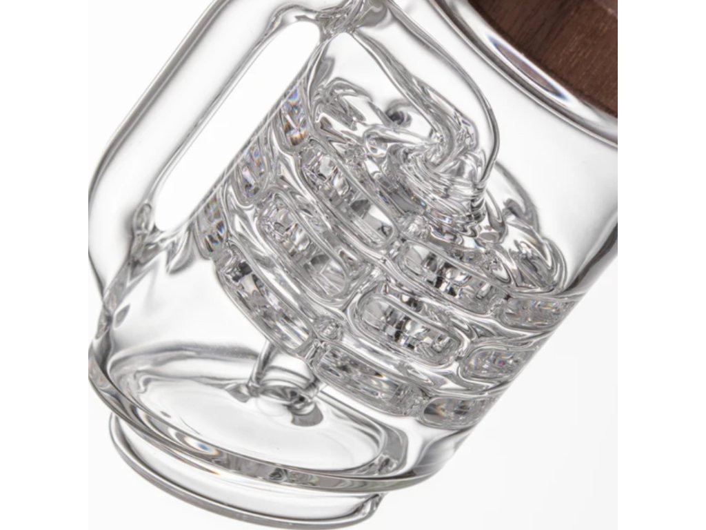 Ergonomický design ve stylu „mug handle“ zajišťuje pohodlný úchop a precizní kontrolu během používání. Kombinace černého ořechu a borosilikátového skla dodává celku luxusní, přírodní vzhled, který se stane ozdobou každého setupu.