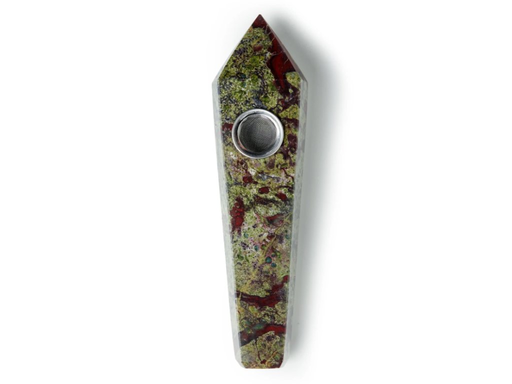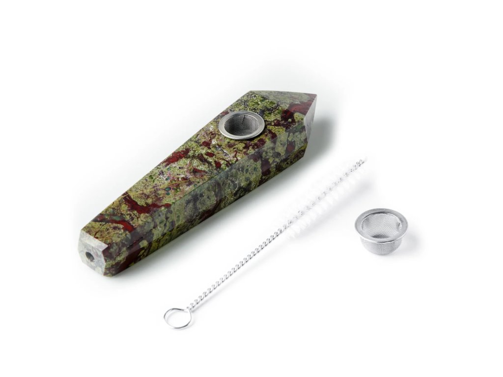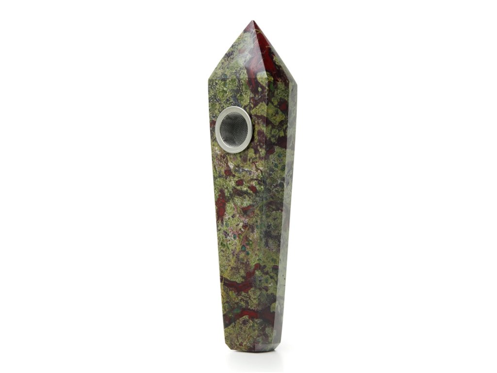 Fajfka Astral Project z kamene dračí krev (Dragon Blood Stone) je jedinečný kuřácký doplněk vyrobený z přírodního minerálu s výraznou kombinací zelených a červených odstínů. Tento kámen je známý svou charakteristickou kresbou, která vytváří originální a nepřehlédnutelný vzhled.
