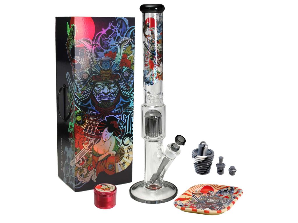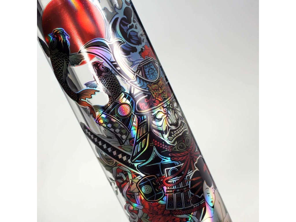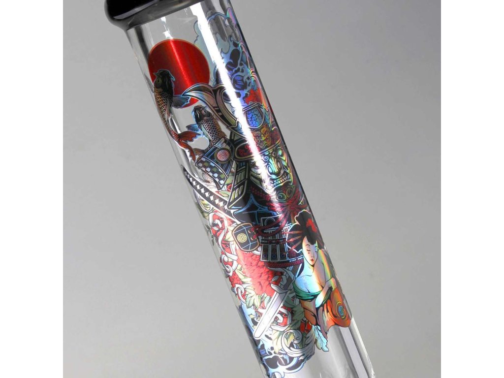 Tento impozantní Black Leaf® bong s motivem RONIN & GEISHA je skutečným sběratelským kouskem, který spojuje dokonalý design a špičkovou funkčnost. Vyrobený z borosilikátového skla o tloušťce 7 mm zaručuje vysokou odolnost a stabilitu. Díky barevnému difuznímu chillumu a 10-ramennému stromkovému perkolátoru je kouř skvěle ochlazen a přefiltrován, zatímco prostorná komora na led umožňuje přidat kostky pro ještě jemnější hit.
