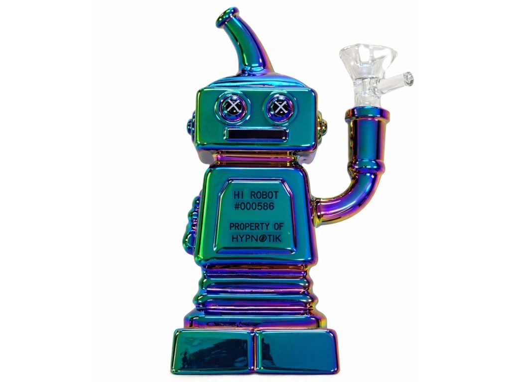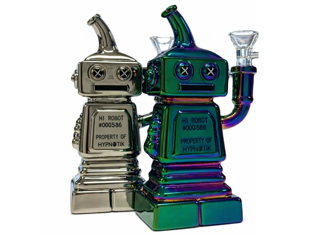 Tenhle bong není jen nástroj – je to designový kousek, který okamžitě upoutá pozornost. Unikátní tvar robota v kombinaci s metalickým povrchem (stříbrná nebo duhová varianta) z něj dělá perfektní doplněk každé sbírky.