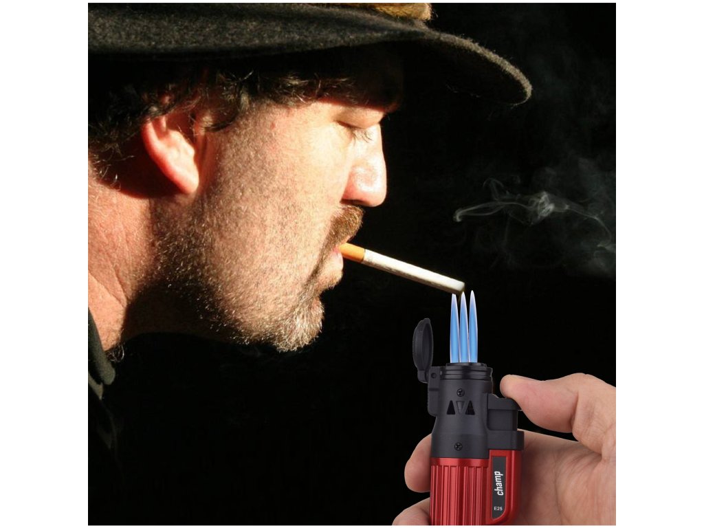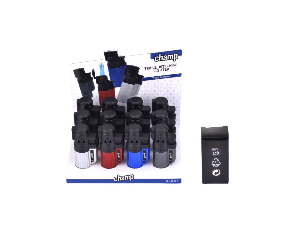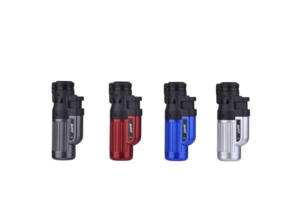 Tryskový zapalovač Champ® Triple JetFlame nabízí tři silné tryskové plameny, které zajišťují rychlé a rovnoměrné zapálení i v náročných podmínkách. Stabilní výkon oceníš zejména při použití venku, ve větru nebo při zapalování bongů, dab rigů či uhlíků.