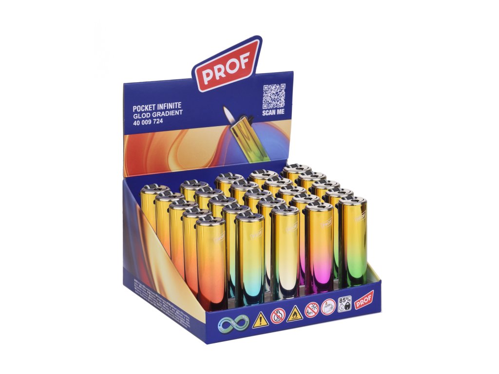 Zapalovač Prof® Gold Metal Gradient spojuje funkčnost s výrazným designem. Kovové tělo s lesklým barevným gradientem působí luxusně a odlišuje se od běžných plastových zapalovačů. Ideální doplněk pro ty, kteří chtějí styl i spolehlivost v jednom.